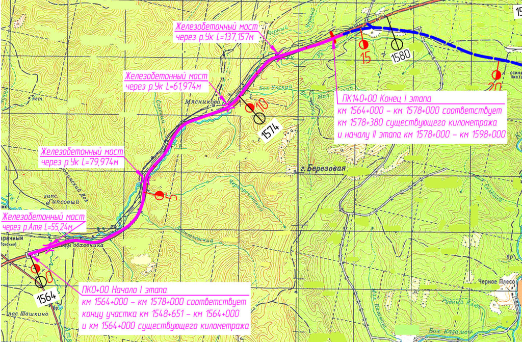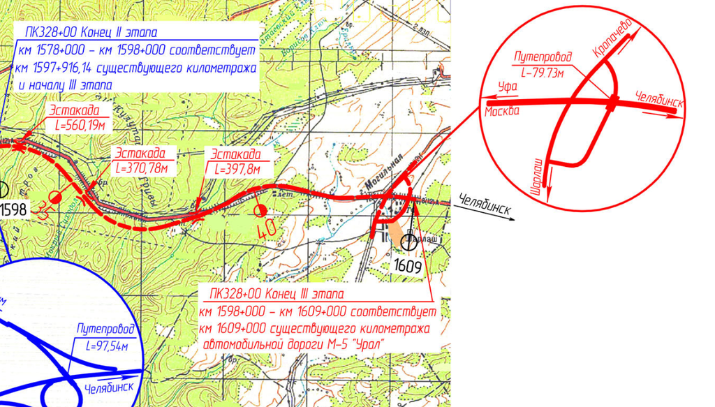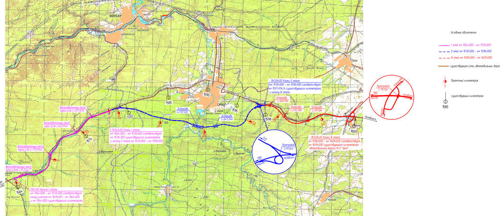 В целом работы на трассе М-5 в Челябинской области поделены на три этапа. Проект предусматривает реконструкцию еще четырех мостов, строительство двух эстакад и двух транспортных развязок. Обход Сима построят на участке трассы с 1578-го км по 1598-й км. Существующую дорогу реконструируют на отрезках с 1564-го км по 1578-й км и с 1598-го км по 1609-й км.